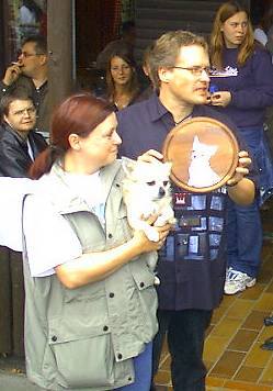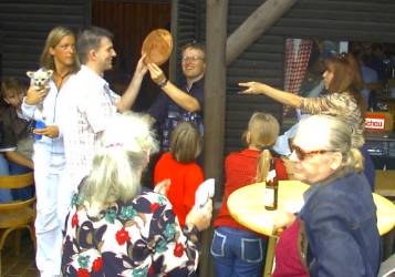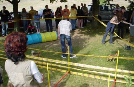 In diesem Jahr hatten wir einen Parcours aufgebaut. Dort mussten die Hunde und auch ihre Besitzer zeigen, was sie so können. Die Hunde mussten die Röhre durchlaufen, über Hürden springen, nach Futter suchen, aber auch die Besitzer mussten mit ran. Ein Lauf um die Hütte gehörte dazu und hinterher ging es noch um 5 Fragen, die beantwortet werden mussten. |